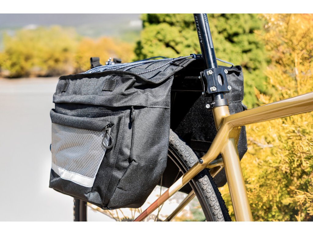 Dvojbrašna je ideální pro cykloturistiku a pro každodenní městské použití. Je vybavenadvěma prostornými, dvěma menšími kapsami, gumicukem na vrchní straně a